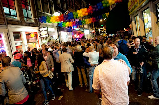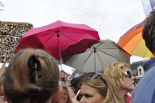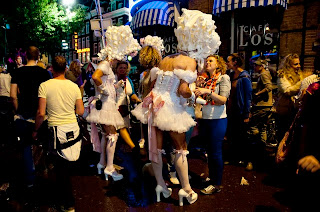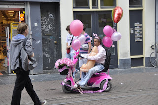 The festival was held on Saturday, 6 August and were told to expect a Canal Parade in the afternoon and street parties that run deep into the night. We were excited about this and made sure we had our fill of their Dutch frites (fries with sauce - more typically creamy mayo) before finding a bridge with a good view to watch the parade. As we strolled along the streets, we were constantly amused to see how the Amsterdammers and tourists have wholeheartedly embraced this festival in their own way. Shops sold pink feathered boas (scarves) and Elton John looking sunglasses. We even spotted a guy riding a pink motorcycle buggy decorated with helium balloons. He was sporting a pink hairband and hugging a blow-up giant penis... yes, you read that right.