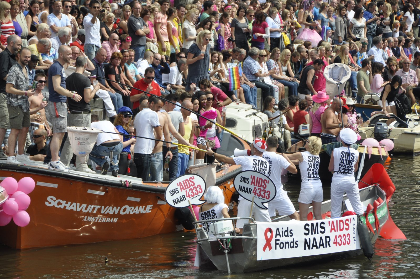 Supporting AIDS boats, using condom nets to collect donations from the spectators.