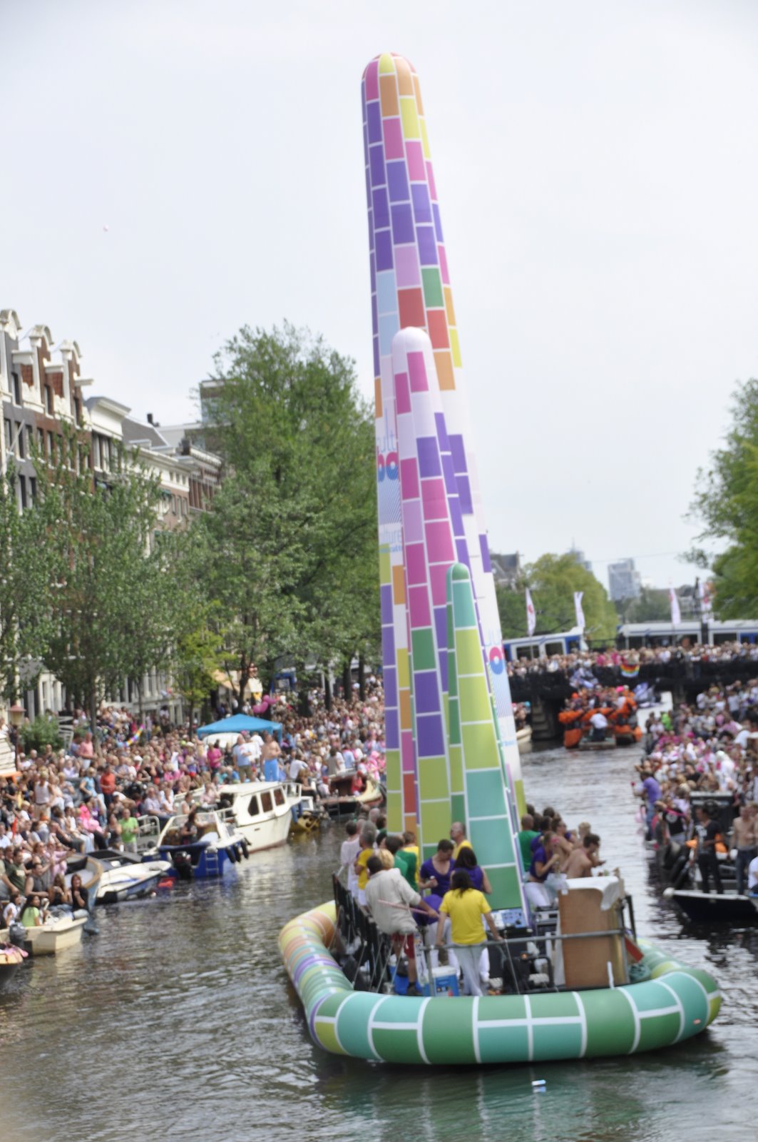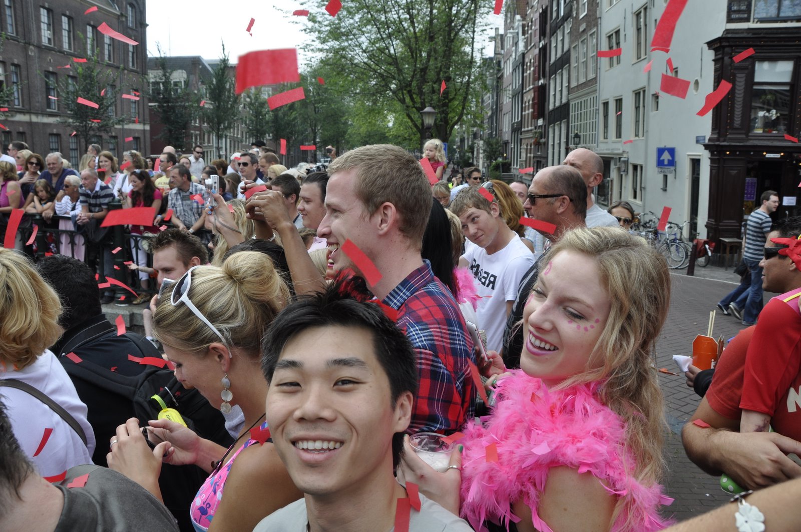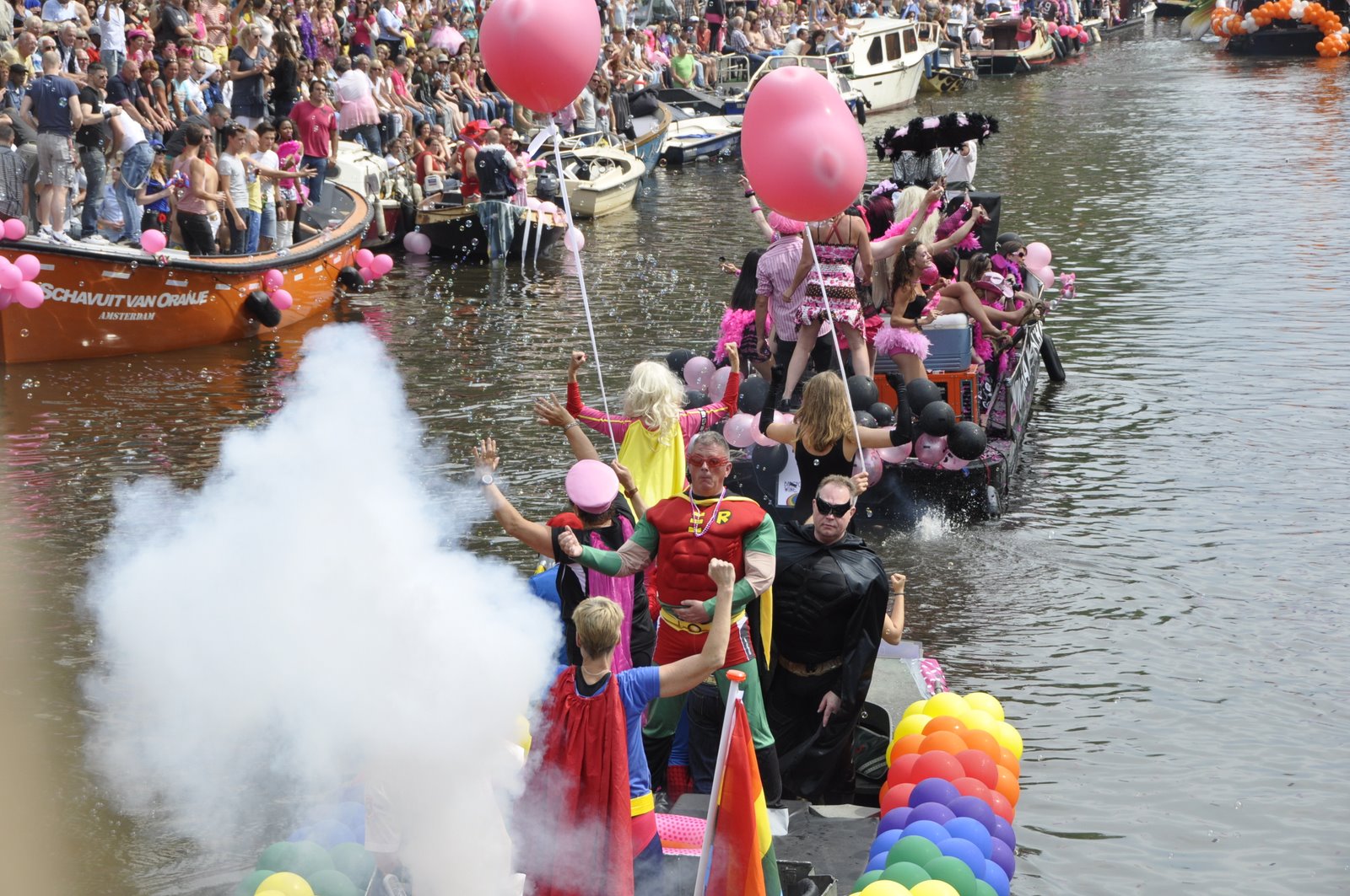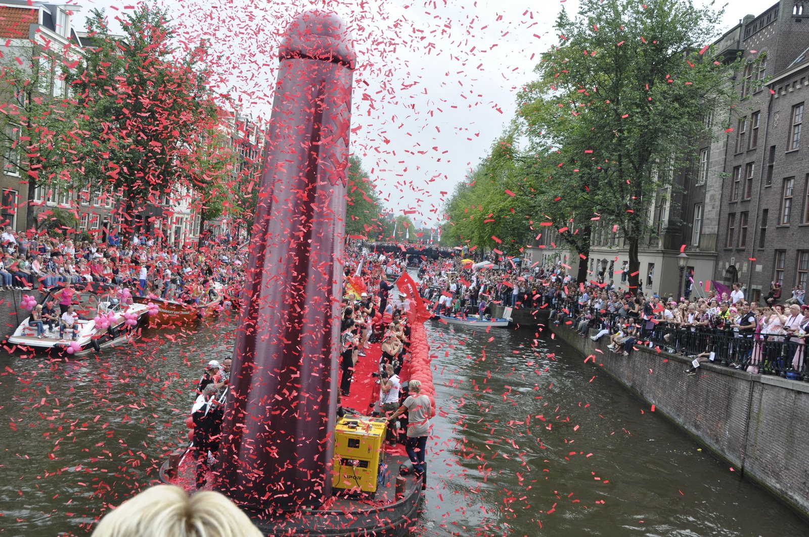 By the time the parade started at 2pm, a large crowd had gathered along the canals and bridge. Many were on their own private boats. Luckily, after a little walking around we found a sweet spot on a bridge overlooking the length of the canal. We were just in time for one of the first floats to arrive. It was a boat featuring a ginormous penis that deflates as the boat sailed under the bridge, and once across immediately inflates, ejecting a cloud of red confetti. It was pure gold.