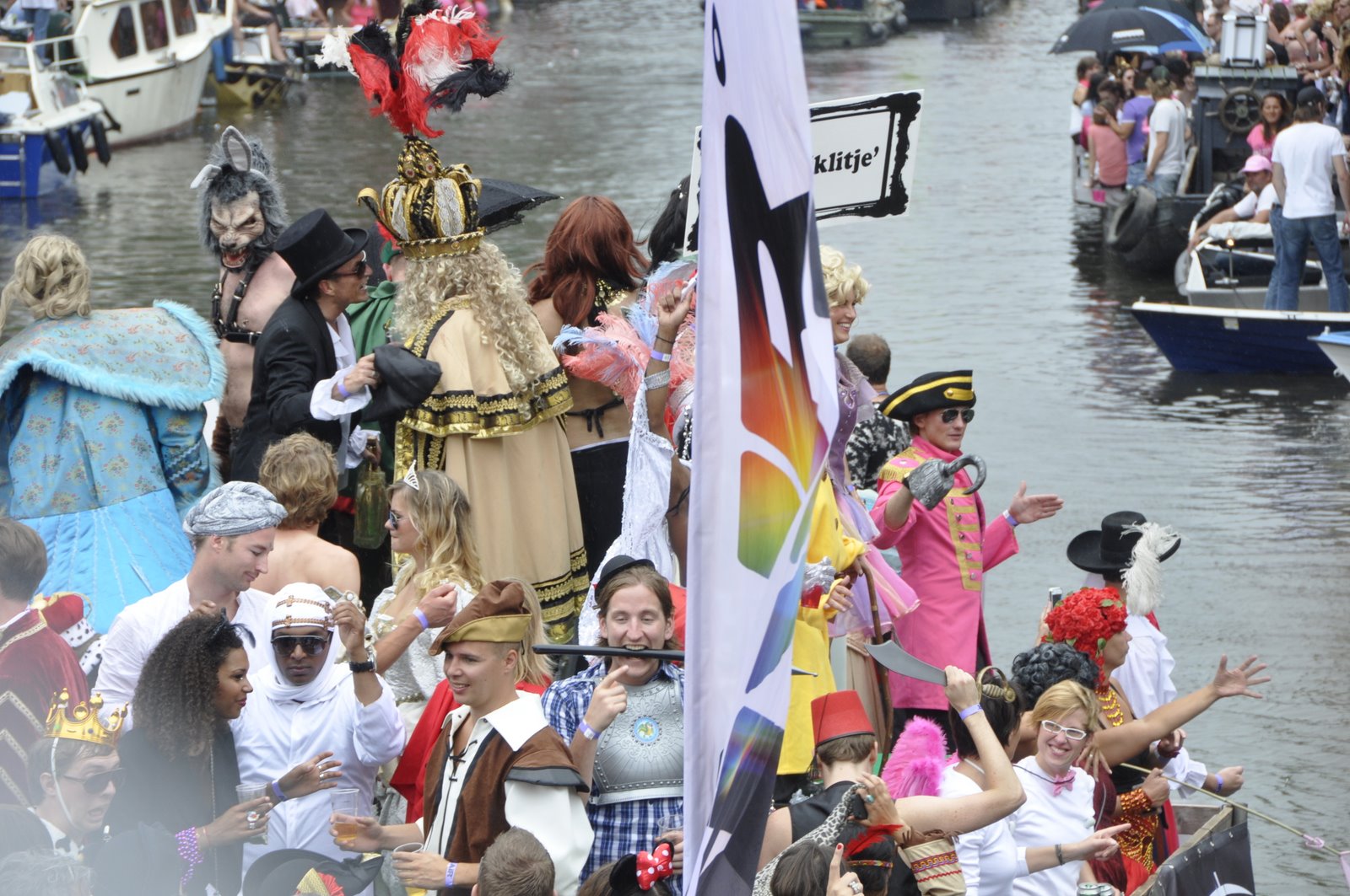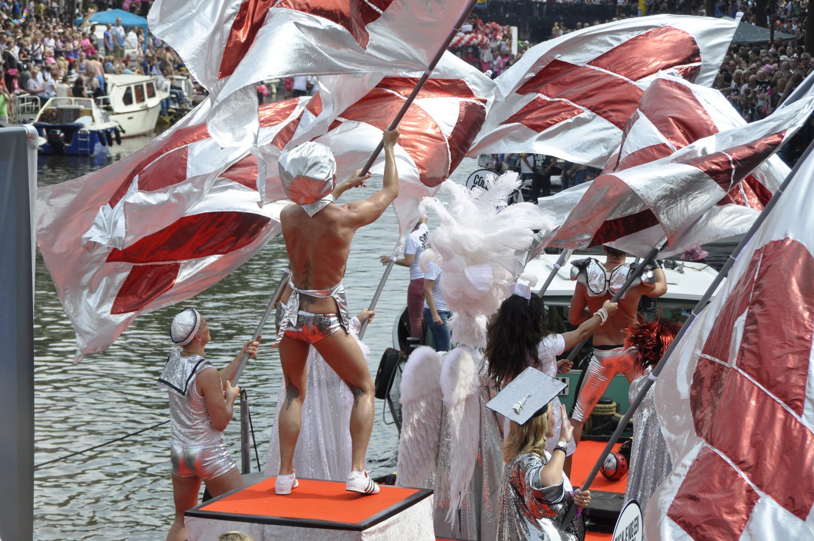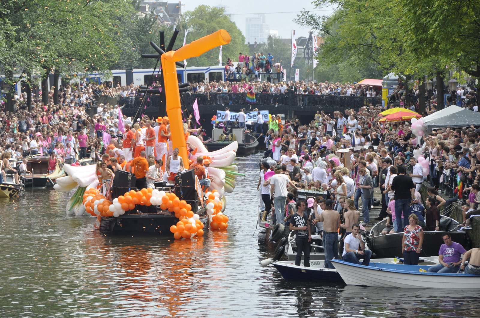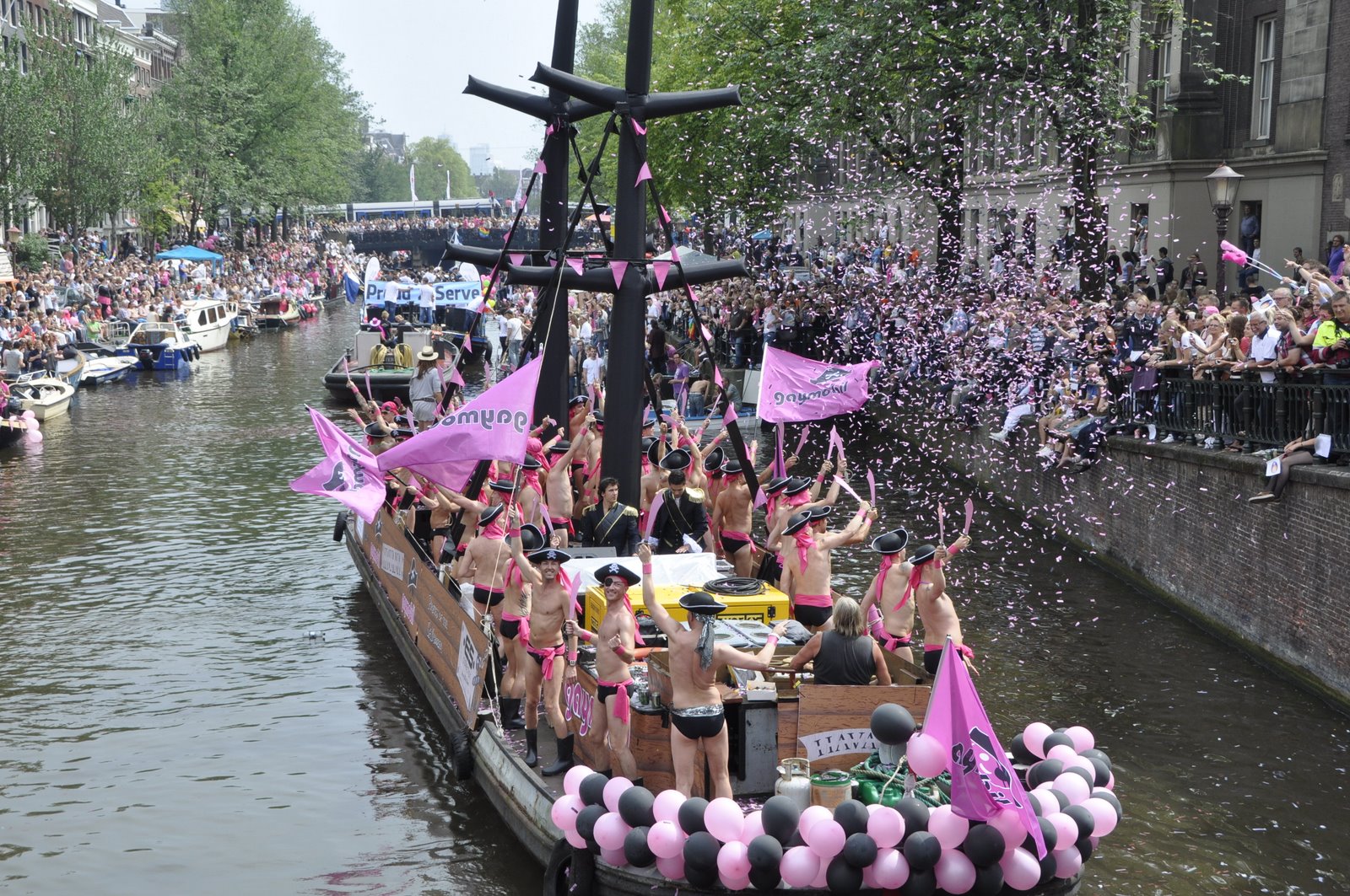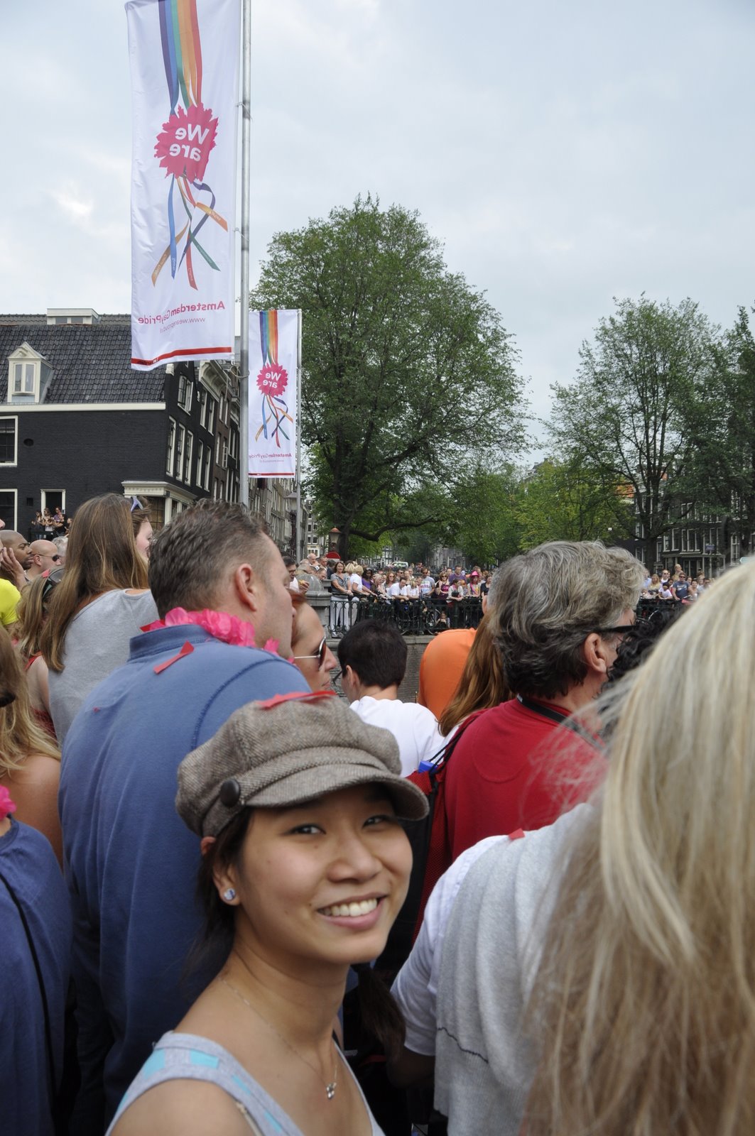By the time the parade started at 2pm, a large crowd had gathered along the canals and bridge. Many were on their own private boats. Luckily, after a little walking around we found a sweet spot on a bridge overlooking the length of the canal. We were just in time for one of the first floats to arrive. It was a boat featuring a ginormous penis that deflates as the boat sailed under the bridge, and once across immediately inflates, ejecting a cloud of red confetti. It was pure gold.