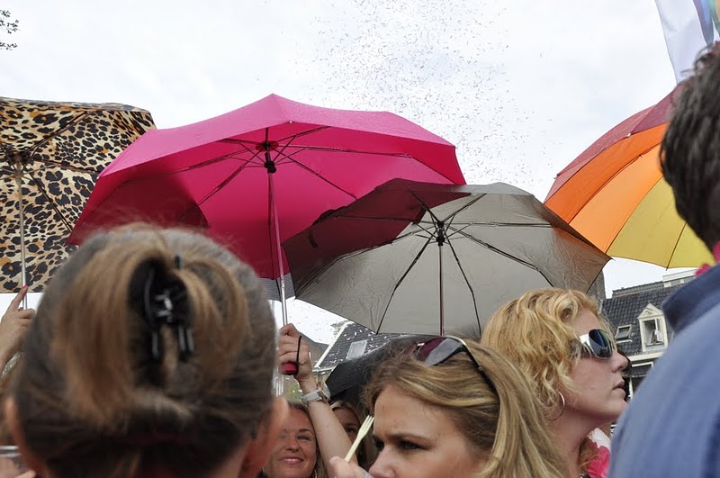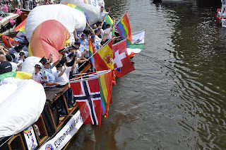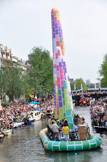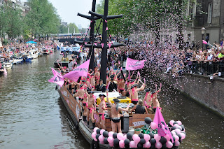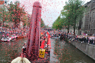 The festival was held on Saturday, 6 August and were told to expect a Canal Parade in the afternoon and street parties that run deep into the night. We were excited about this and made sure we had our fill of their Dutch frites (fries with sauce - more typically creamy mayo) before finding a bridge with a good view to watch the parade. As we strolled along the streets, we were constantly amused to see how the Amsterdammers and tourists have wholeheartedly embraced this festival in their own way. Shops sold pink feathered boas (scarves) and Elton John looking sunglasses. We even spotted a guy riding a pink motorcycle buggy decorated with helium balloons. He was sporting a pink hairband and hugging a blow-up giant penis... yes, you read that right.