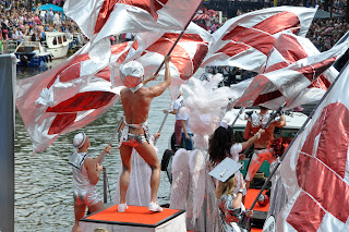 One after another, floats cruised down the canal. We laughed out loud at what unfolded. Each float sported their own theme and I don't think there was a gay stereotype that wasn't explored and exploited. There were the hard hat construction workers, police force, pirates, drag queens and even superheroes! It was happy chaos on the boats as they danced to their theme music and jazzed up their audience. Many even had their own dance groove as they sailed along.
