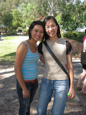 We rushed out to buy more 'picnic' nibbles and organised for Andy's sister to bring a picnic 'rug'. After doing abit of a mad dash in Safeway, we returned just in time to meet the arrival of a few friends. The picnic rug (which turned out to be a huge plastic sheet) was quickly laid out and Andy proceeded to use an unused bbq stove next to the nearest gazebo. After receiving protests from the gazebo's occupants, who believed they also 'booked' the public stove, we managed to cook all our sausages and meats.