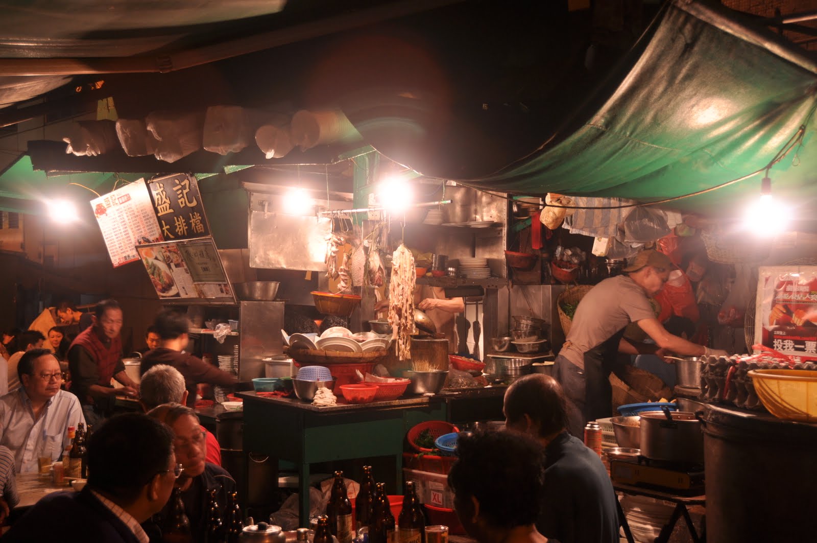 Surrounded by warm hanging light globes, strings of intestines, salted mackeral and baskets of fresh vegetables, the chef busies himself in front of his fiery wok.