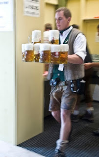 We walked around the beer hall and found these waiters lining up to collect the 1 litre beer mugs for their thirsty customers. It was an amazing sight to watch as each waiter and waitress carried about 8-10 mugs in one go, 10 litres and that's not even counting the weight of the glass mugs (which are heavy!)