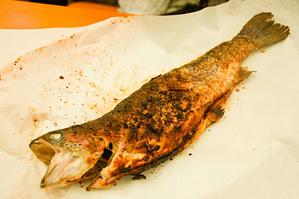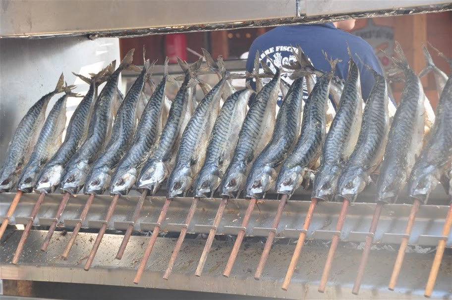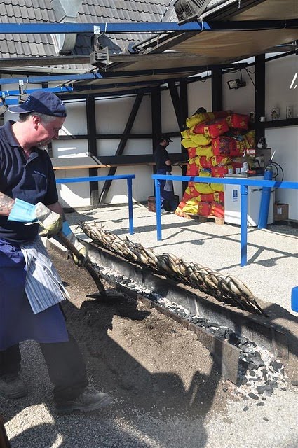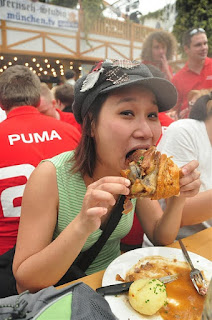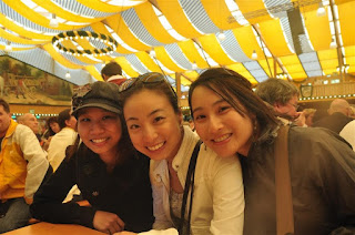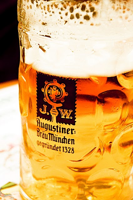 My favourite beer hall has to be the Augustiner beer tent. We found this hall with our noses - it was the heavenly smell of smoked fish. Mmm. These salt seasoned fishes (called Lachsforelle) were stretched on a stick and laid over hot coals. We found seats in the hall and ordered our beers and fish. The fish was beautifully seasoned and cooked just right - it was the best fish I've ever had in a very long time. This coupled with the refreshingly light Augustiner beer was the best combination ever!