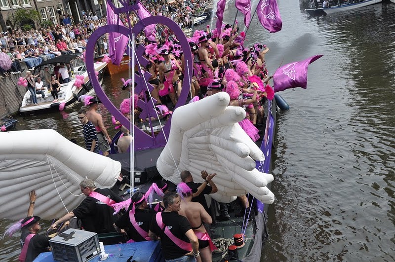 The festival was held on Saturday, 6 August and were told to expect a Canal Parade in the afternoon and street parties that run deep into the night. We were excited about this and made sure we had our fill of their Dutch frites (fries with sauce - more typically creamy mayo) before finding a bridge with a good view to watch the parade. As we strolled along the streets, we were constantly amused to see how the Amsterdammers and tourists have wholeheartedly embraced this festival in their own way. Shops sold pink feathered boas (scarves) and Elton John looking sunglasses. We even spotted a guy riding a pink motorcycle buggy decorated with helium balloons. He was sporting a pink hairband and hugging a blow-up giant penis... yes, you read that right.
